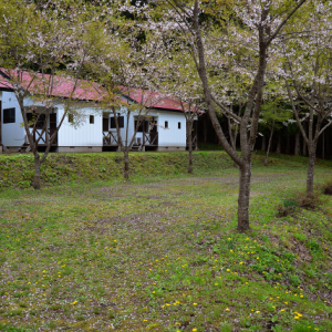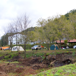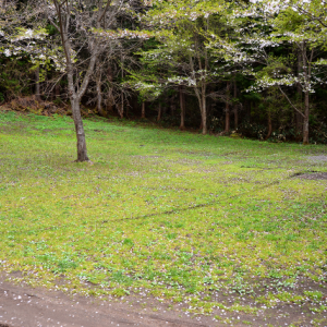 タイプ オートフリーサイト 地面は比較的ペグの刺さりやすい土です。桜の木などで仕切られていますが、今のところはっきりした区画も設けておりません。大きなテントも余裕をもって設営できるエリアもあります。