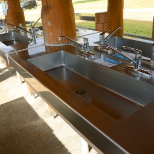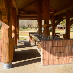 コテージ、Aサイトを除く、各サイトエリアに1棟ずつ設置しております。流し台、作業台などが設置され、ご家族から団体利用など目的にあった様々なタイプがあり、使いやすい施設となっております。もちろん、蛇口からはお湯がでます。