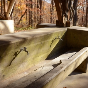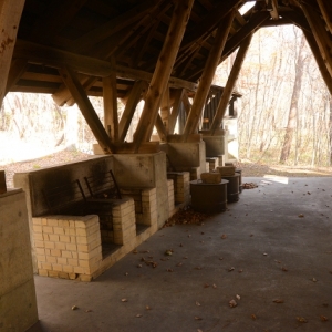 野外炊飯場(夜間照明あり) かまどと、流し台があります。周囲には屋外テーブルも設置しています