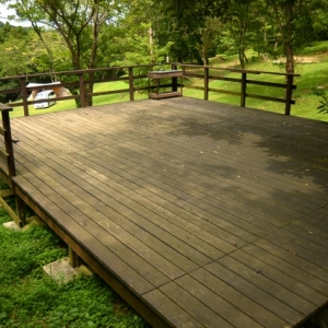 焚き火をする場合は必ず、デッキ対応の焚き火台と焚き火シートを敷いてください。